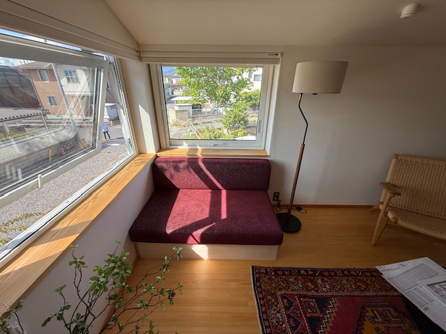 - 造作ソファーは違和感なく納まり、存在感を主張しすぎず、身体を受け止める安心感を持っていました。硬すぎず柔らかすぎず、適度な反発感がありました。