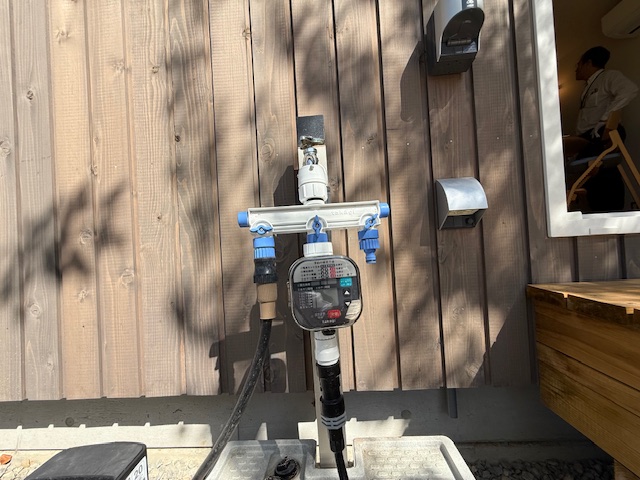 またお引き渡し後にお客様が植栽を管理する場合、特に真夏の暑い時期や真冬の寒い時期、体調のすぐれない高齢のご家族が水やりを行う場合にも、負担は大きくなります。そのような状況でも、この「かんたん水やりタイマー」があれば、設定した時間に自動で水をまいてくれるため、誰の負担にもならずに植栽の健康を保つことができます。これは、日々の植栽の管理をサポートしてくれる心強い味方です。