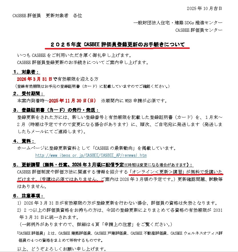 10/14に、一般財団法人住宅・建築 SDGs 推進センター(IBECs) 内CASBEE評価員センターから、以下の「CASBEE評価員更新のご案内」のメールが届きました。