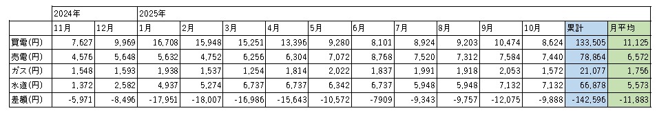 ・表右下を見て頂くと、電気・ガス・水道に太陽光売電を加味した総光熱費の月平均は11,883円でした。