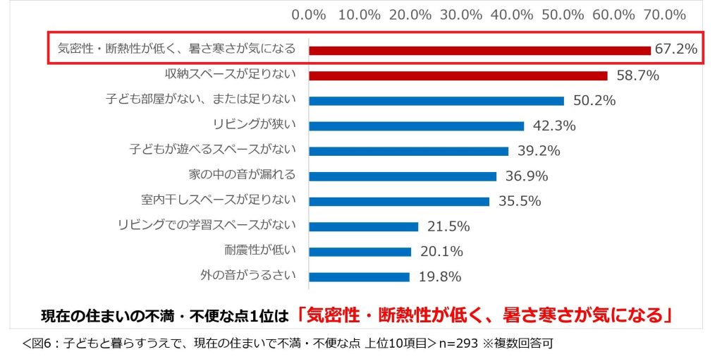 住まいの不満・不便の上位に「気密性・断熱性が低く、暑さ寒さが気になる」が挙がる、という調査があります。実際に、子育て世帯を対象にした調査では不満理由の最多がこれで、67.2%でした。