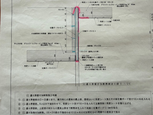どちらにしても、断熱・気密ラインが難しくなりそうな場所は、設計時に「断熱気密の詳細図」を描いた上で、現場監督が職人達に断熱・気密工事の手順を説明する必要があります。