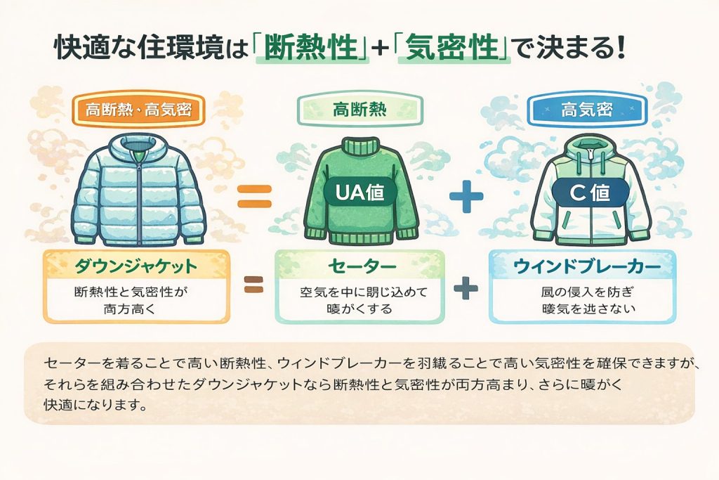 セーター(断熱性)とウィンドブレーカー(気密性)の2つを組み合わせたような、ダウンジャケット(高断熱高気密住宅)なら、断熱性と気密性の両方が確保されて暖かい。